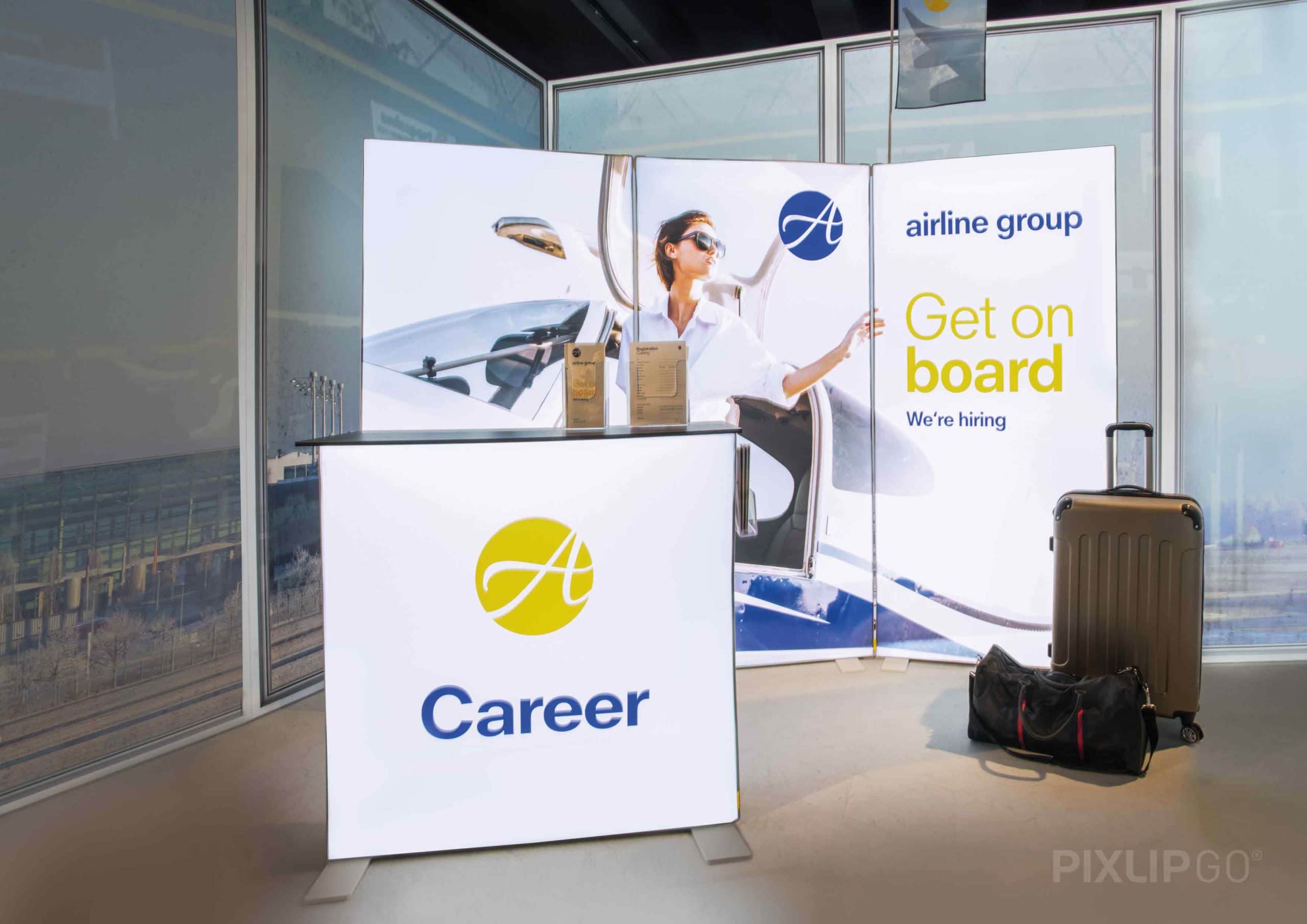 Das modulare Baukastenprinzip bietet nicht nur unterschiedliche Rahmenhöhen und eine Vielzahl an praktischen Anbauteilen, sondern ermöglicht auch die flexible Verbindung mit anderen Rahmen zu ganzen Messeständen. Die individuell bedruckten Textilien machen jeden Pixlip Go zu einem Unikat: Immer wieder auf‘s Neue. Ändert sich die Botschaft, lassen sich die Textilien schnell und problemlos auswechseln.